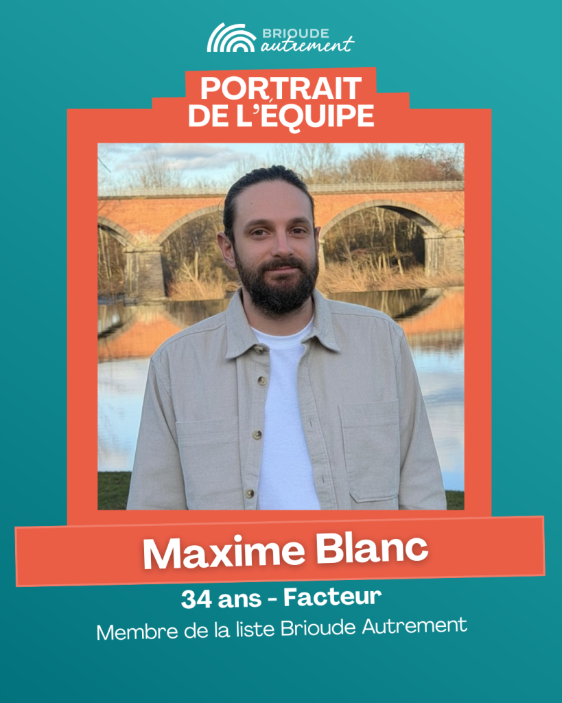 Je m’appelle Maxime Blanc, j’ai 34 ans, j’habite et travaille à Brioude comme facteur. Fils et petit‑fils de commerçants, j’ai presque toujours vécu ici, où j’ai suivi toute ma scolarité. Je suis parti trois années travailler et voyager entre l’Australie, les Caraïbes, la Suisse et le Brésil, et j’en suis revenu en parlant trois langues, dont le portugais.